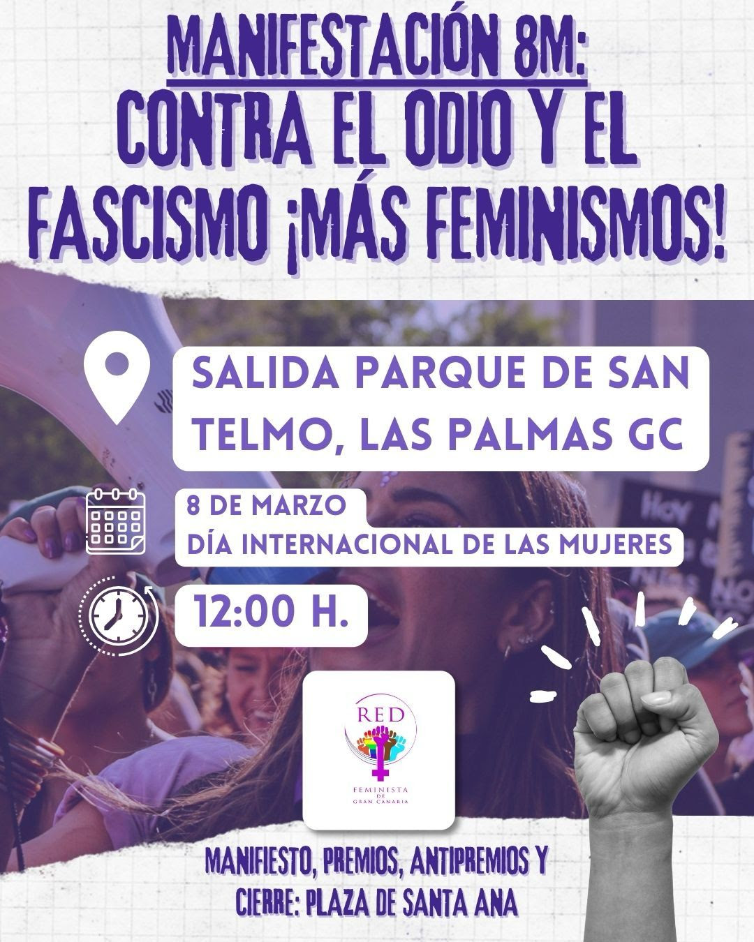 Bajo el lema “Contra el odio y el fascismo: ¡Más feminismo!”, la Red Feminista de Gran Canaria celebra este sábado 8 de marzo una nueva manifestación en Las Palmas de Gran Canaria en conmemoración del Día Internacional de las Mujeres.
