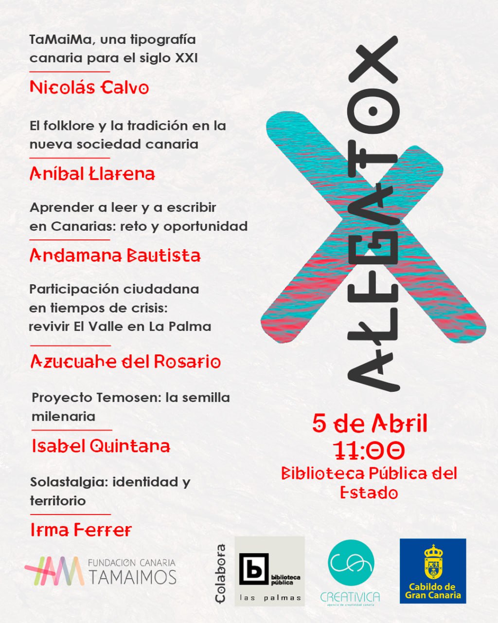 La Fundación Canaria Tamaimos impulsa los Alegatox 2025, un evento tradicional en cada Foro Bucio. Cuenta con la participación del público, donde tras cada intervención se abre un pequeño espacio de intercambio de opiniones. Ahora la entidad ha querido separarlo para celebrar un acto exclusivo en Las Palmas de Gran Canaria este sábado, 5 de abril desde las 11:00 en la Biblioteca Pública del Estado de la capital grancanaria. La entrada es libre hasta completar el aforo.