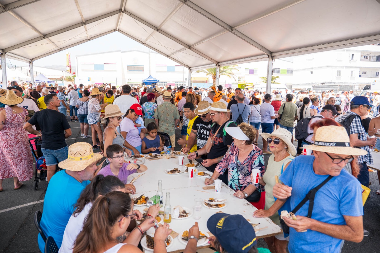 Ya durante el mediodía, se celebró el tradicional asadero popular, donde se distribuyeron más de 1.000 kilos de caballas de Arguineguín, 120 kilos de papas arrugás, 100 litros de mojo y 50 kilos de gofio. Todo ello fue preparado con esmero por más de 30 voluntarios, vecinos del barrio de El Poblado, quienes junto a sus hijos han manetenido vivo este legado generacional que se remonta a más de cuarenta años de historia.