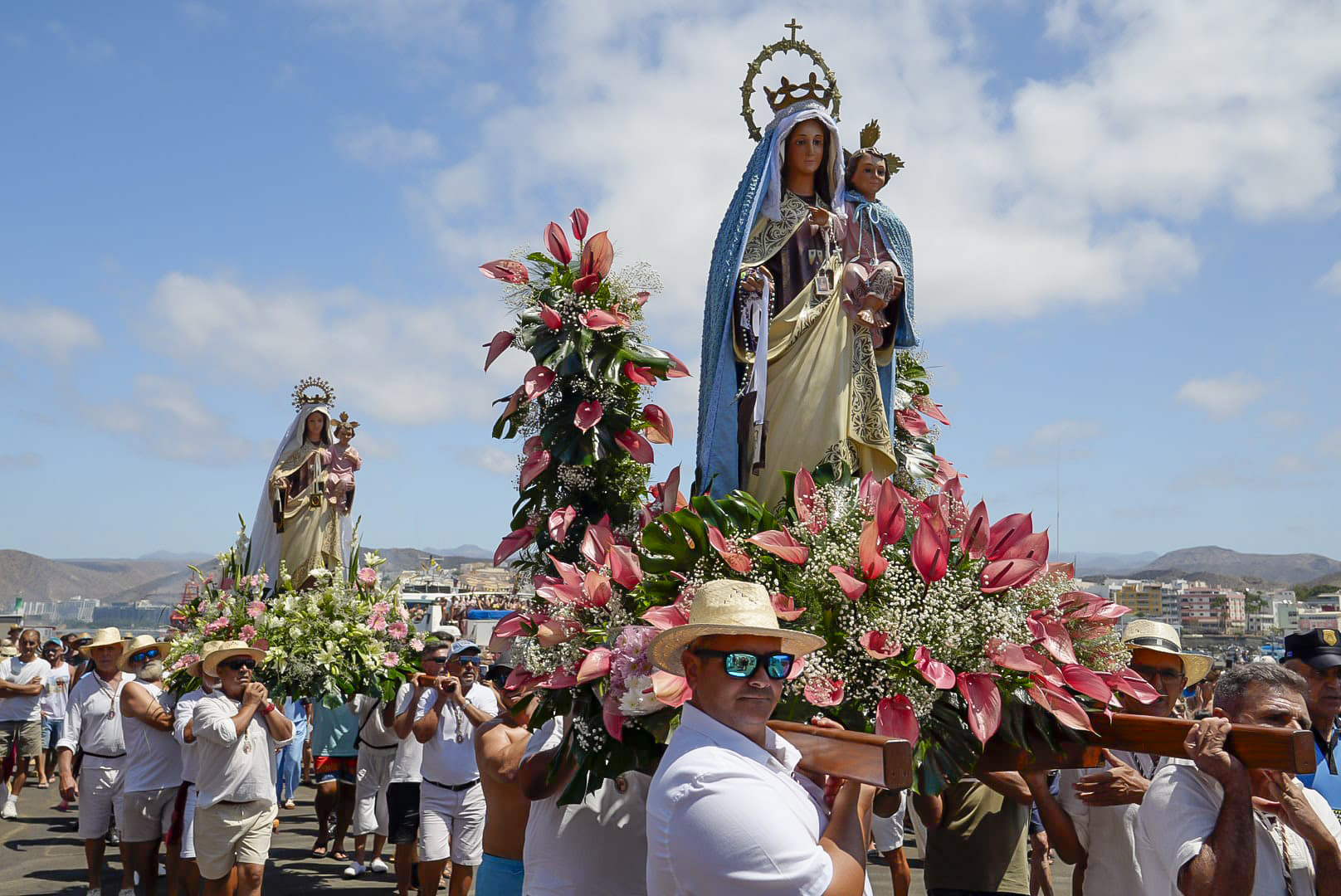 La procesión contó con la participación de una flota compuesta por una decena de barcos pesqueros y un nutrido número de embarcaciones recreativas, alrededor de 200, que, entre toques de bocina y vítores, escoltaron a la Virgen todo el trayecto. El ambiente festivo fue compartido por cientos de vecinos y visitantes tanto en el mar como en tierra firme, todos y todas con el objetivo de vivir de cerca el esperado encuentro de las dos imágenes, el segundo del año, ya que el primero se produjo hace tan solo dos semanas cuando la Virgen de Arguineguín visitó Playa de Mogán.