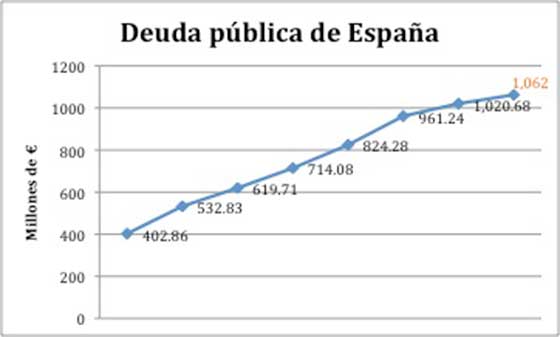 Según los datos hechos públicos por el Banco de España correspondientes el mes de septiembre de 2015 la deuda pública del Estado español correspondiente al gobierno metropolitano, autonomías y ayuntamientos se sitúa por encima del billón (con b de burro) de euros (€), exactamente en un billón sesenta y dos mil millones de €, lo que supone el 99.3 por ciento del producto interior bruto (PIB), la mayor cuantía de la serie histórica de deuda trimestral iniciada en 1995, datos que hemos incluido en el gráfico adjunto y que incluye la serie trimestral cerrada en septiembre desde el año 2008, que fue de cuatrocientos dos mil millones, hasta el 2015.