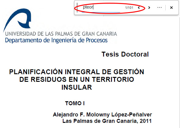 Pero en realidad no hace falta ninguna inteligencia artificial para notar el asunto, simplemente buscando en el PDF de su tesis de algo más de 500 páginas las siglas ‘pteor’ aparecen 101 resultados que se corresponden mayormente con cuadros y tablas extraídos tal cual del Plan de Residuos de Tenerife que, aprobado por la unanimidad del pleno del Cabildo en el año 2009 (con el señor Molowny de técnico interino pero sin ningún protagonismo especial en la redacción del documento por el que entre otras cosas se pagó a una consultora vasca) al final ha servido para que algunos se aprovechen de él para su currículum personal porque quince años después, con aquello del «nuevo modelo» de Valbuena en 2015 y el propio Molowny, todo quedó en agua de borrajas.