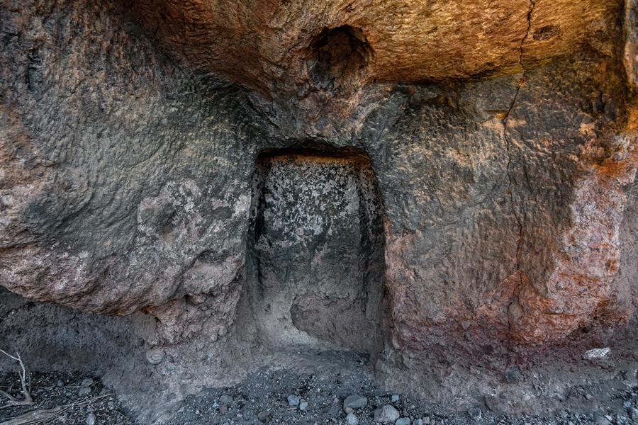 Aunque ya conocíamos algunos casos más en la isla de La Palma, en el año de 2021 registramos, por primera vez, la presencia de una puerta falsa en el yacimiento cultual de El Bocarón (Barlovento, La Palma). Está excavada en la pared y presenta unas dimensiones aproximadas de 2 m de alto por 0,70 m de ancho. Su forma es triangular y contiene un escalón de entrada y una cúpula en el interior de la estructura (Rodríguez Vassou y Martín González, 2021: 17).