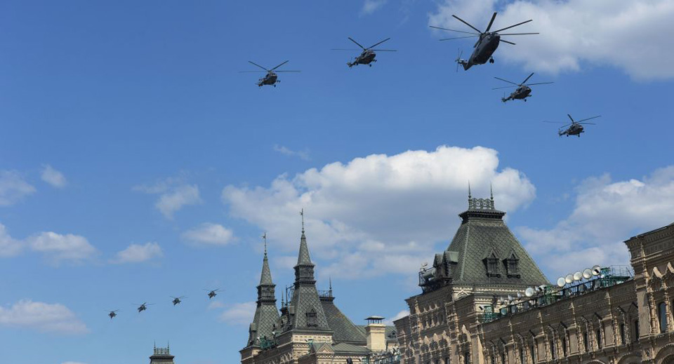 En línea uniforme sobrevolaron los aviones ‘Su-24M’, ‘Su-25’, ‘Su-27’, ‘Su-34’, ‘MiG-29SMT’, ‘MiG-31BM’, ‘An-124-100 Ruslán’, ‘Il-78’, ‘Il-76MD’, ‘Tu-22M3’, ‘Tu-95MS’, ‘Tu-160M’, ‘Su-35S’ y los helicópteros ‘Mi-8AMTSH’, ‘Mi-26’, ‘Mi-28N’. Además, tomaron parte en el ensayo los helicópteros ‘Cazador Nocturno’ y ‘Ka-52 Alligator’ —que participaron en la operación antiterrorista en Siria—. Los helicópteros ‘Mi-35’ y los aviones modernizados ‘Il-76MD90A’ sobrevolaron la capital por primera vez. Pero el momento álgido del ensayo fue la dispersión de humo con los colores de la bandera nacional por los cazas ‘Su-25’.