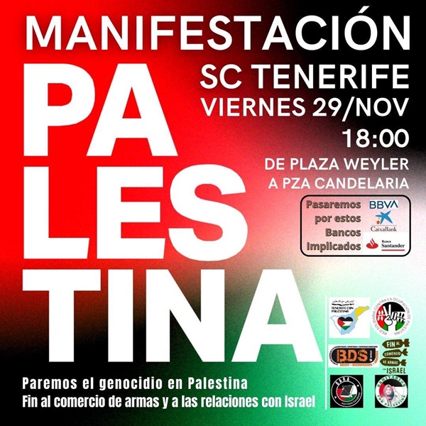 En Tenerife saldremos el viernes 29 de noviembre. La manifestación de Santa Cruz de Tenerife está convocada por la Plataforma Tenerife con Palestina, BDS Tenerife, Asamblea Estudiantil Gara y Sanitarios por Palestina, contando además con el apoyo de colectivos y organizaciones sociales y sindicales de la isla.