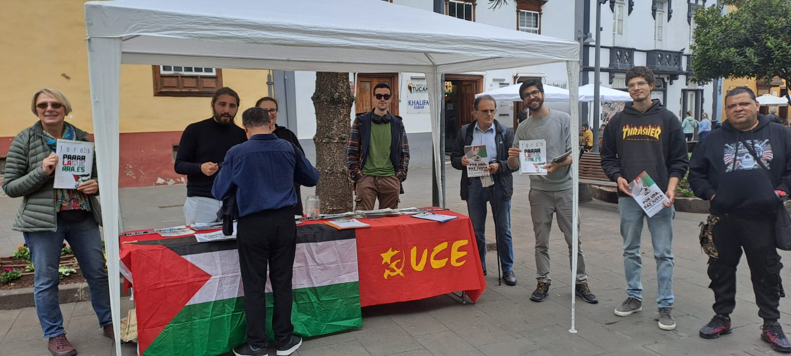 Este sábado 15 de marzo, Unificación Comunista de España (UCE) ha intensificado su campaña por la paz en Palestina con la instalación de mesas informativas en Canarias. Las acciones se llevaron a cabo en la Plaza de la Concepción de San Cristóbal de La Laguna, Tenerife, y en la calle Triana de Las Palmas de Gran Canaria. El objetivo principal fue la recogida de firmas para exigir un alto el fuego inmediato en Palestina, bajo el lema "Por la paz, alto el fuego ya, ni terrorismo ni genocidio".
