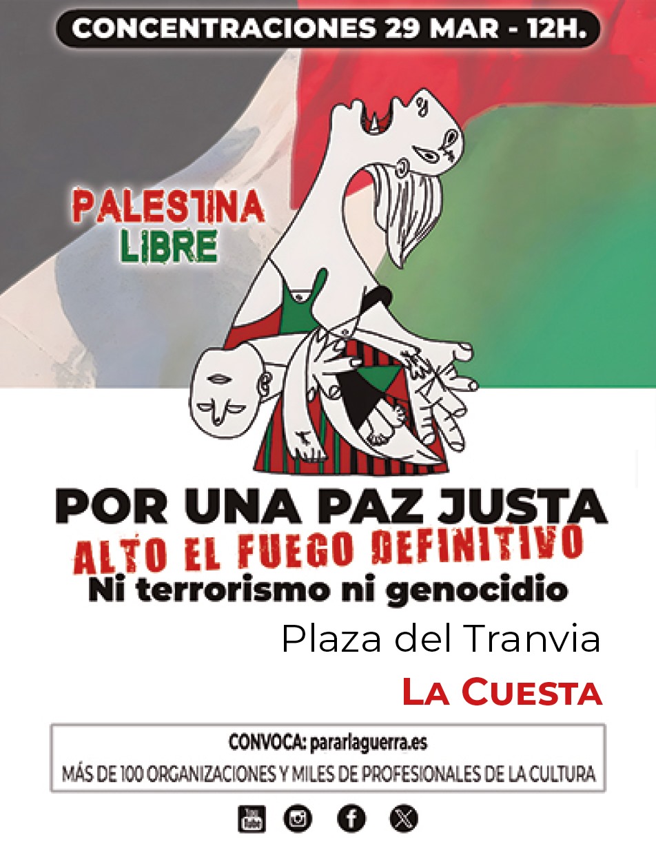 El movimiento ParaLaGuerra.es, formado por 100 organizaciones y miles de profesionales de la Cultura, convoca concentraciones en todo el país, en hasta 85 poblaciones para denunciar la ruptura del Alto el Fuego por parte de Israel y los asesinatos de inocentes que están cometiendo en los últimos días, agravando el genocidio que viene cometiendo.
