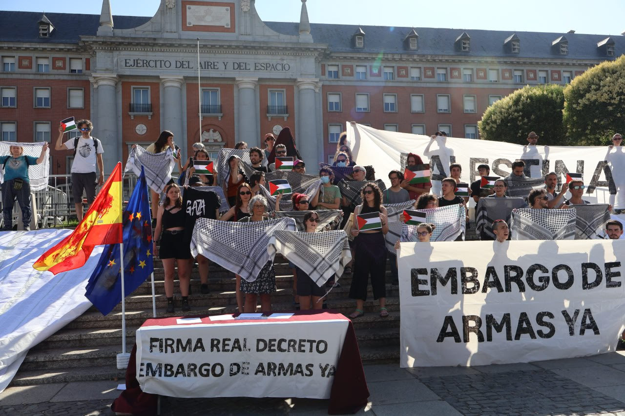 El pasado 20 de mayo el Congreso aprobó la proposición de ley para imponer el embargo de armas a los países que estén siendo investigados por genocidio por la Corte Penal Internacional, registrada por Sumar y Podemos, impulsada por la Red Estatal Contra la Ocupación en Palestina (RESCOP) y apoyada por más de 500 organizaciones sociales. La tramitación de la ley todavía tendrá que pasar por varias fases hasta su aprobación definitiva con unos plazos que pueden demorarse, mientras los colectivos denuncian con su protesta que el ejecutivo puede declarar de manera inminente un embargo integral de armas a Israel que comprenda la compra, la venta y tráfico de armas por puertos y aeropuertos españoles.