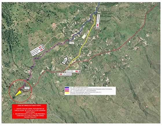 Las obras que se están realizando en la carretera de interés regional LP-2, en el tramo San Simón-Tajuya (La Palma), provocarán a partir del próximo martes, día 19 de abril, un desvío provisional en la intersección entre las carreteras LP-2 y LP-206, en el punto kilométrico 7+500 (aproximadamente el pk 18 de la LP-2), zona conocida como Puente Roto. Además de la remodelación que se ejecutará en ese cruce, los trabajos también incluyen la ampliación de las obras de drenaje trasversal que canalizan los dos barrancos que discurren y se unen bajo ese punto de la vía.