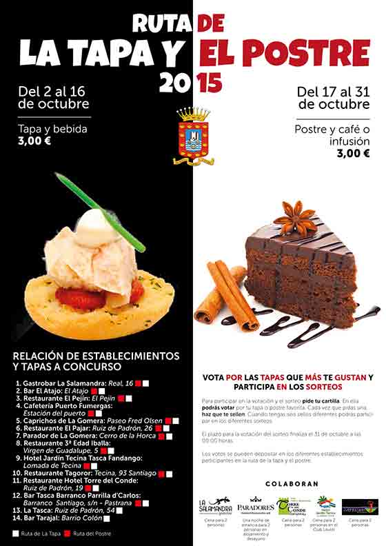 Los establecimientos partícipes se encuentran dispersos por el municipio. En Tecina se ofrecerán tapas tan suculentas como el Restaurante Tagoror con su Pimiento del Piquillo Relleno y Gratinado al Parmesano, y su postre Babalúa de Piña. Así como, el Hotel Jardín Tecina “Tasca Fandango” hace lo mismo con la tapa Salmorejo Mar y Monte con Tostado de Ibérico y Pincho Crujiente de Langostino, y el postre Dúo de Macarrón Gomero Relleno de Espuma de Miel de Palma y Mouse de Gofio. El Bar Tasca Barrranco Parrilla d´Carlos deleita a sus clientes con la tapa Montadito Agando y el postre Praly de Chocolate. Y el Bar Tarajal concursará con su tapa Atún en el Estilo Canario.