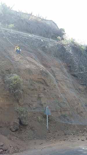 El Cabildo de La Palma, a través de la Consejería de Infraestructuras y Obra Pública, que dirige Jorge González, ejecuta trabajos de mejora en la seguridad vial en un talud situado en el kilómetro 55 de la carretera LP-2, concretamente en el acceso al Puerto de Tazacorte desde el Pueblo, en el que se están instalando mallas de triple torsión y donde se va a realizar un gunitado.