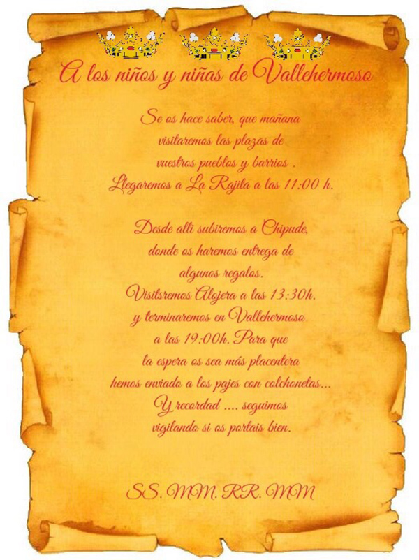 Sus majestades de Oriente hacen saber a todos los niños y niñas de Vallehermoso que este martes visitarán todas las playas y barrios del municipio, llegando a La Rajita a las 11.00 de la mañana.