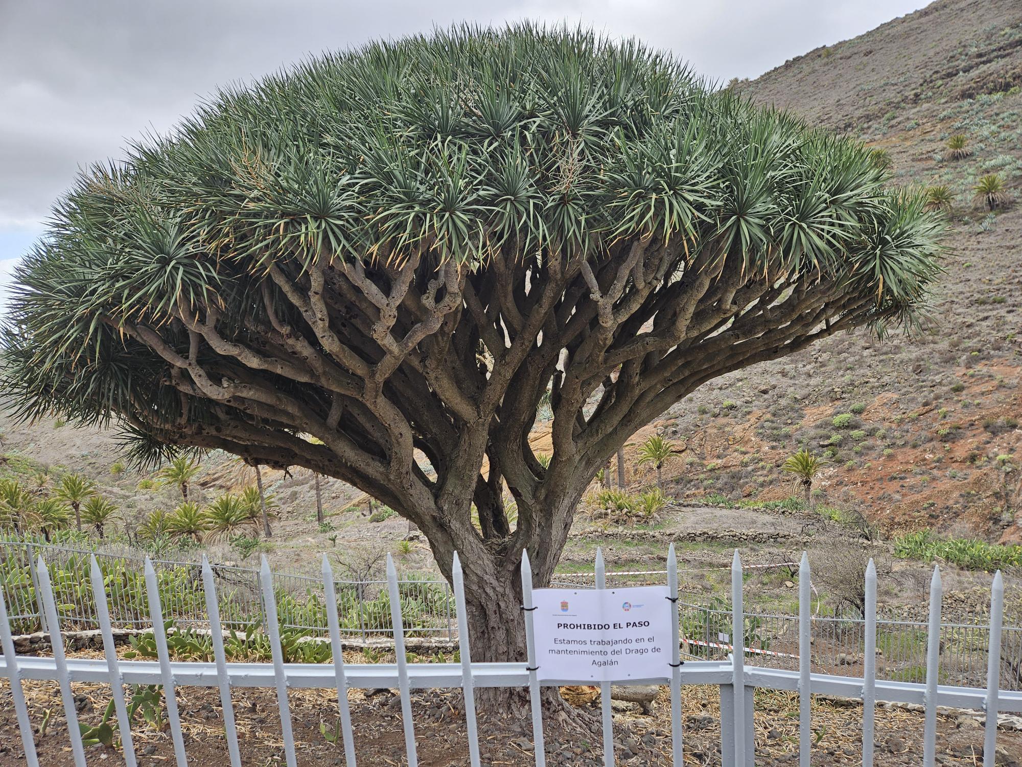 El pasado mes de noviembre el Drago de Agalán considerado el ejemplar de sus características más antiguo y de mayor envergadura de La Gomera, ubicado en el municipio de Alajeró, en una de las laderas del Barranco de Tajonaje, muy cerca del Caserío de Agalán sufrió un desprendimiento de una de sus ramas por causas que aún se desconocen.