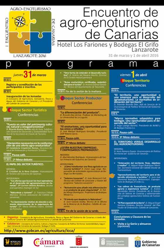 La consejería de Agricultura de Agricultura, Ganadería, Pesca y Aguas del Gobierno de Canarias, a través del Instituto Canario de Investigaciones Agrarias (ICCA), y el Cabildo de Lanzarote organizan el I Encuentro de Agro-Enoturismo de Canarias, iniciativa que busca profundizar en las posibilidades de desarrollo de esta actividad económica de gran potencial en el Archipiélago, y que cuenta con la colaboración de las Consejerías de Turismo, Cultura y Deportes; y Política Territorial, Sostenibilidad y Seguridad; la Cámara de Comercio de Lanzarote y Bodegas El Grifo.