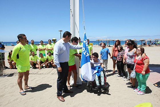 El director del equipo de socorristas de las zonas de baño de Arona y miembros de la Asociación de Padres Orobal, en nombre de las personas con diversidad funcional, fueron los encargados de izar la bandera en la playa de Las Vistas junto al alcalde, José Julián Mena, en una jornada en la que también se celebró la concesión al municipio de la distinción "Playa inclusiva: sol y mar para todos", una de las dos que se han entregado en España y que pone en valor los esfuerzos del municipio en pro de la accesibilidad y el baño adaptado.