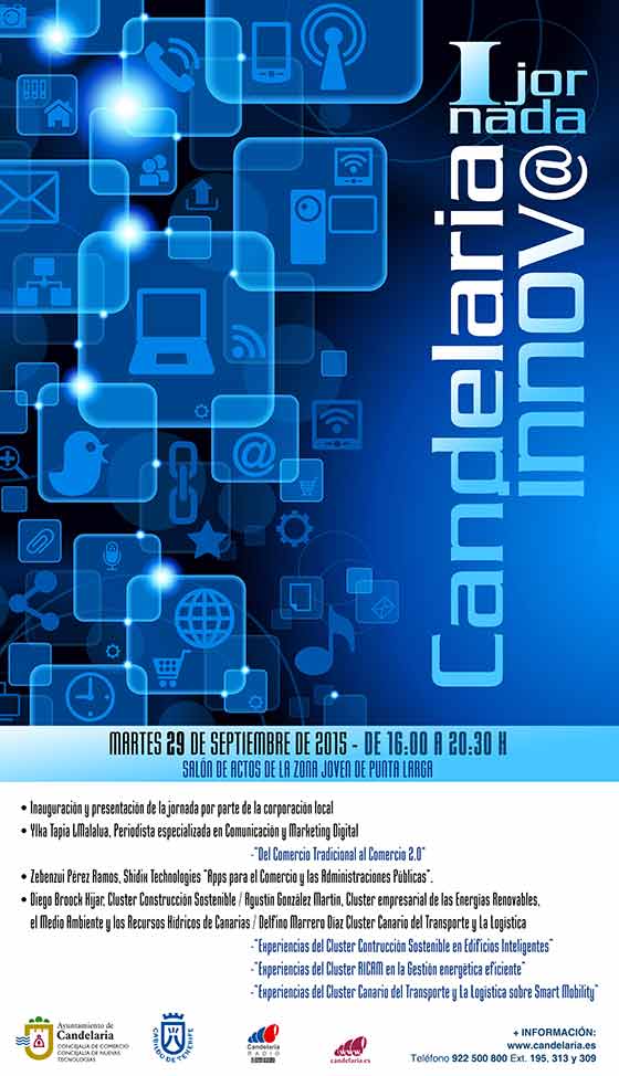Candelaria Innova contará tres ponencias, la primera de ellas a cargo de Ylka Tapia Lmalaula, periodista especializada en Comunicación y Marketing Digital, la segunda con Zebenzuí Pérez Ramos de “Shidix Tecnologies” ,Apps para el Comercio y las Administraciones Públicas” y en la tercera participarán los representantes de clúster empresariales: Diego Brock Hijar, Agustín González Martín y Delfino Marrero Díaz.