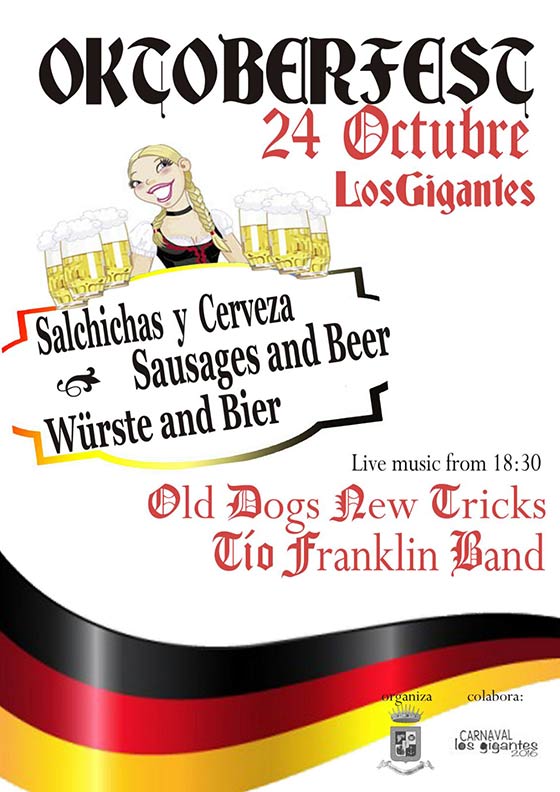 Se trata de la típica fiesta alemana de la cerveza que se basa en el modelo alemán de la célebre festividad que tiene lugar cada año en la ciudad bávara de Múnich. Desde las 18:30 horas, tanto residentes como visitantes podrán disfrutar de la gastronomía alemana( salchichas y cervezas) a precios reducidos con la que quién acuda podrá colaborar con la organización del próximo Carnaval de Los Gigantes 2016.