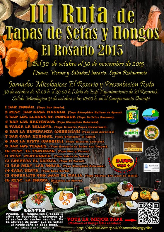 Dicha iniciativa cuenta con la participación de 16 establecimientos de la zona alta del municipio dedicados a la restauración, lo que aumenta la oferta con respecto a los 12 locales que se inscribieron el año pasado. Las tascas, bares y restaurantes participantes elaborarán una tapa específica donde uno o más de sus ingredientes será la seta, siendo el resto de sus ingredientes de libre elección. Cada tapa se venderá al precio de 2,5 euros e incluirá la bebida (caña, vino del país, agua o refresco). Las tapas estarán disponibles al público todos los jueves, viernes y sábados durante el tiempo que dura la III Ruta de la Tapa de Setas y Hongos, mientras que el resto de días de la semana lo harán según la disponibilidad que estipulen cada uno de los establecimientos participantes.