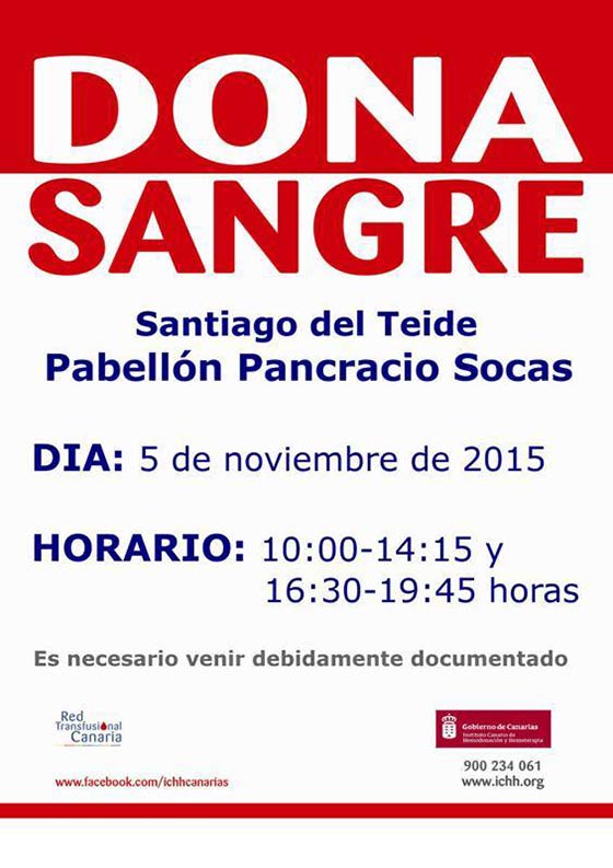 El Instituto Canario de Hemodonación y Hemoterapia del Gobierno de Canarias en colaboración con el área de Sanidad del Ayuntamiento de la Villa Histórica de Santiago del Teide que dirige Sergio Mendoza comunica que la guagua itinerante de hemodonación de sangre se encontrará en los exteriores del Complejo Deportivo “Pancracio Socas García” este jueves 5 de noviembre, en horario de 10:00 a 14:15 y de 16:30 a 19:45 horas.