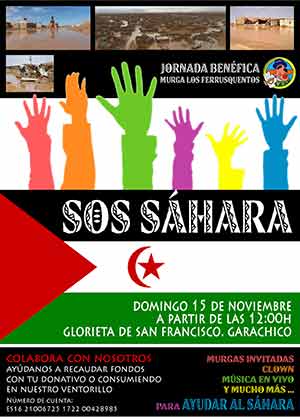 La murga Los Ferrusquentos se solidariza con el Sáhara este domingo 15. Las intensas lluvias que azotaron la isla de Tenerife hace unas semanas también dejaron graves secuelas en los campamentos de saharuis en Tinduf. Las pocas infraestructuras que tenían se han inundado, las tuberías y otros sistemas de abastecimiento se han roto y si antes su situación era precaria, ahora lo es más.