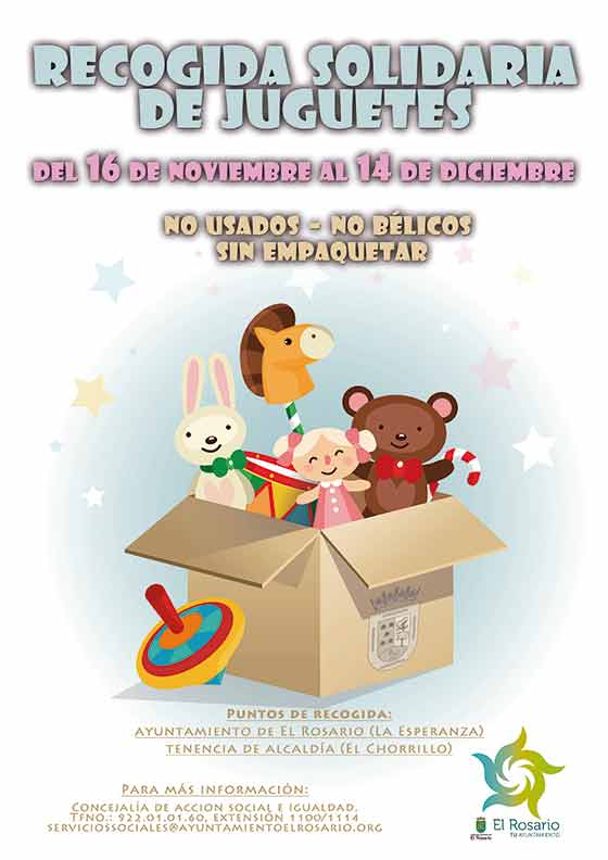 El Ayuntamiento de El Rosario impulsa, a través del área de Acción Social e Igualdad que gestiona la edil Fátima Gutiérrez, una campaña de recogida de juguetes para destinar a los niños y niñas de familias con menos recursos del Municipio. De esta forma, desde ayer lunes, 16 de noviembre, y hasta el 14 de diciembre todas las personas que quieran colaborar con esta iniciativa solidaria podrán entregar sus juguetes en el Ayuntamiento, en La Esperanza, o en la Tenencia de Alcaldía, en Llano Blanco. Los juguetes tendrán que ser nuevos y no bélicos y se entregarán sin empaquetar.