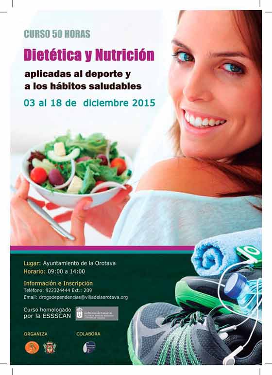 El Curso de Nutrición y Dietética aplicadas al deporte y los hábitos saludables, que tiene 50 horas de duración, está homologado por la ESSSCAN y será impartido por el monitor Carlos Castro Díaz. Las clases se desarrollarán entre el 3 y el 18 de diciembre en horario de mañana, de 9.00 a 14.00 horas, en la Casa de la Juventud de La Orotava.