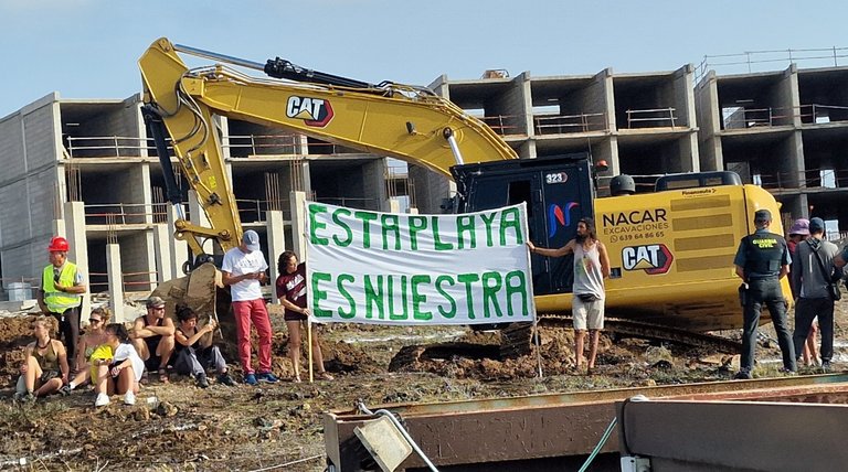 Durante la mañana de ayer, un grupo de diez personas, a través de una acción directa de resistencia pacífica, ha paralizado las obras que la constructora Viqueira está llevando a cabo sobre el Dominio Público Marítimo Terrestre en la zona del hotel de La Tejita.