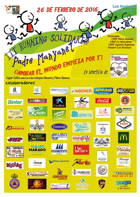 Los colegios Nazaret, CEIP Pérez Zamora, CEIP Agustín Espinosa y CEIP La Montañeta celebrarán este viernes 26 de febrero a partir de las 10:00 horas de la mañana el III Running Solidario Padre Manyanet, tras aplazarse la pasada semana a consecuencia del temporal de lluvia. Se prevé la participación de más de 1.200 escolares de estos cuatro centros educativos.