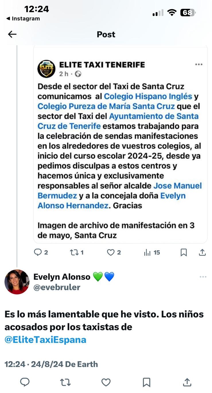 El tuit fue publicado el sábado 24 de agosto a las 12:24 horas, y posteriormente borrado, aunque existen documentos gráficos que lo acreditan. En él, la concejala hace referencia al anuncio de manifestación realizado por Élite Taxi Tenerife, en el que se avisa a los colegios Hispano Inglés y Pureza de María de que se verán afectados por sendas manifestaciones al comienzo del curso escolar, y en el que se piden disculpas de antemano y se explica que los responsables últimos son la propia Evelyn Alonso y el alcalde, José Manuel Bermúdez.