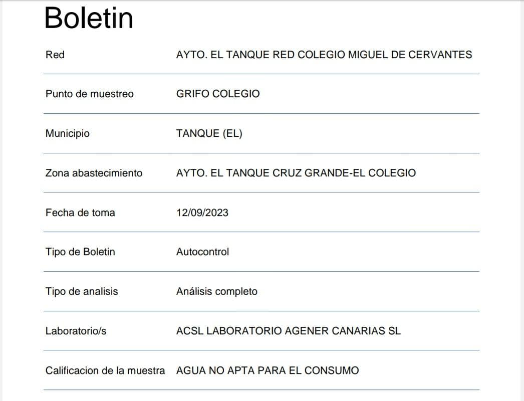 Coalición Canaria El Tanque denunció que los vecinos y las vecinas del municipio consumieron agua no potable según lo demuestran una serie de analíticas del Sistema de Información Nacional de Aguas de Consumo (SINAC) del Ministerio de Sanidad del Gobierno de España.