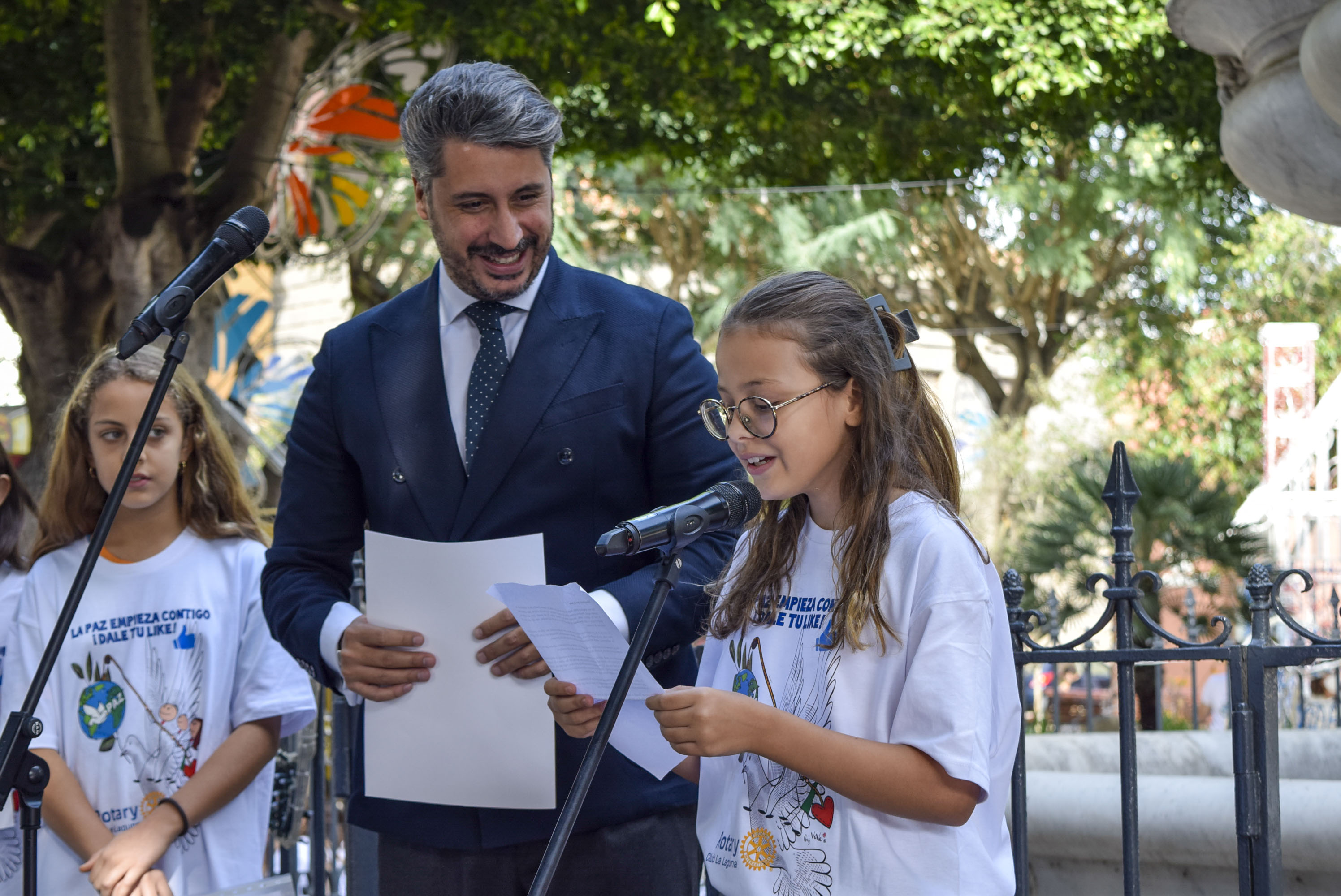 El alcalde de La Laguna, Luis Yeray Gutiérrez, recibió a la multitud de niños y niñas de este Paseo por la Paz en la plaza del Adelantado, nombre que recuerda a su fundador y centro político de esta ciudad ya desde los inicios del siglo XVI, la primera de su momento no fortificada, trazada bajo criterios renacentistas y que fue la referencia para muchas urbes hispanoamericanas posteriores.