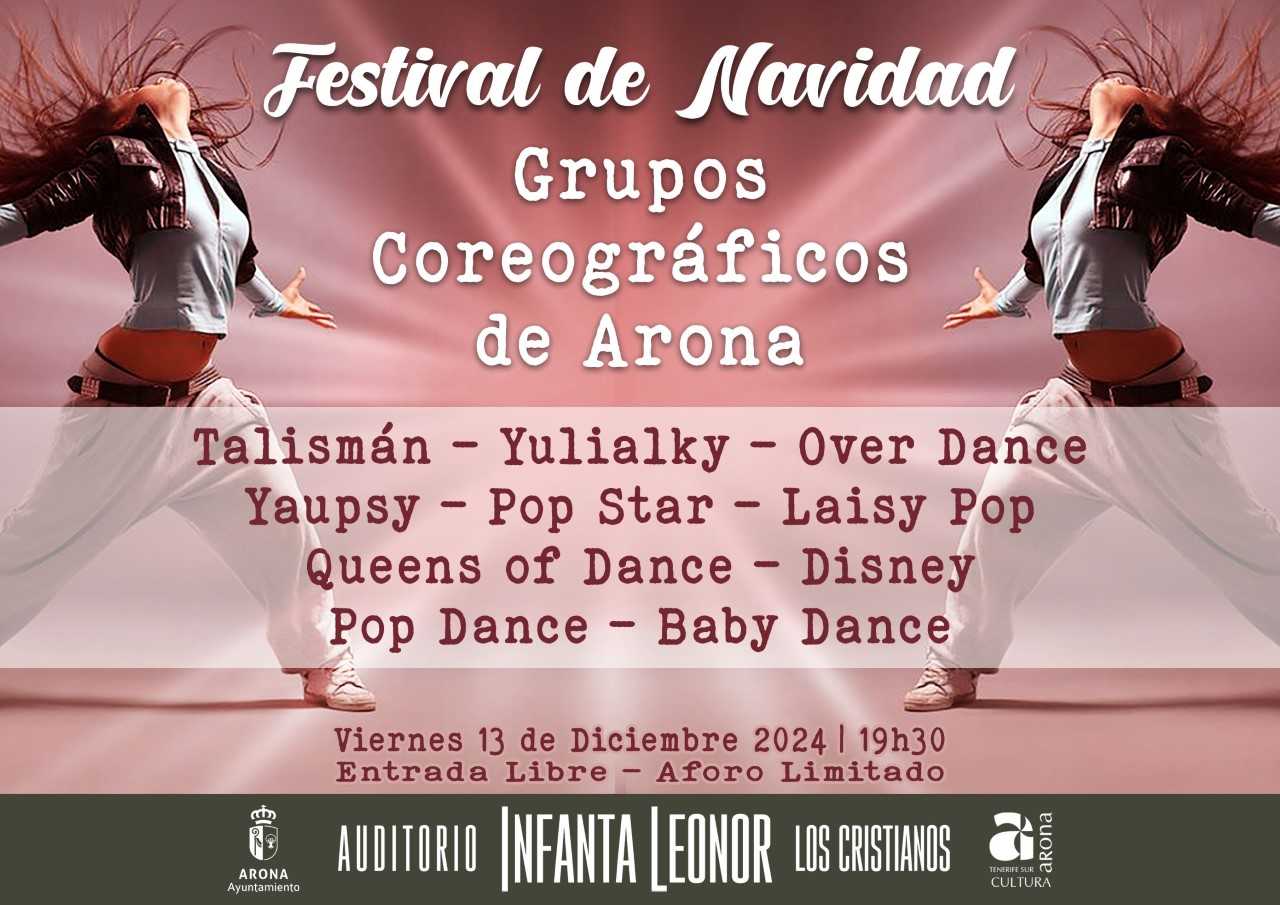 El viernes 13 tendrá lugar uno de los acontecimientos más esperados durante el mes de diciembre: El Festival de Navidad de los Grupos Coreográficos del Patronato de Cultura de Arona. El Auditorio Infanta Leonor de Los Cristianos acoge, a partir de las 19:30 horas con entrada libre hasta completar el aforo, un espectáculo en el que el protagonismo corre a cargo de los grupos Talismán, Yulialky, Over Dance, Yaupsy, Pop Star, Laisy Pop, Queens of Dance, Disney Pop Dance y Baby Dance.