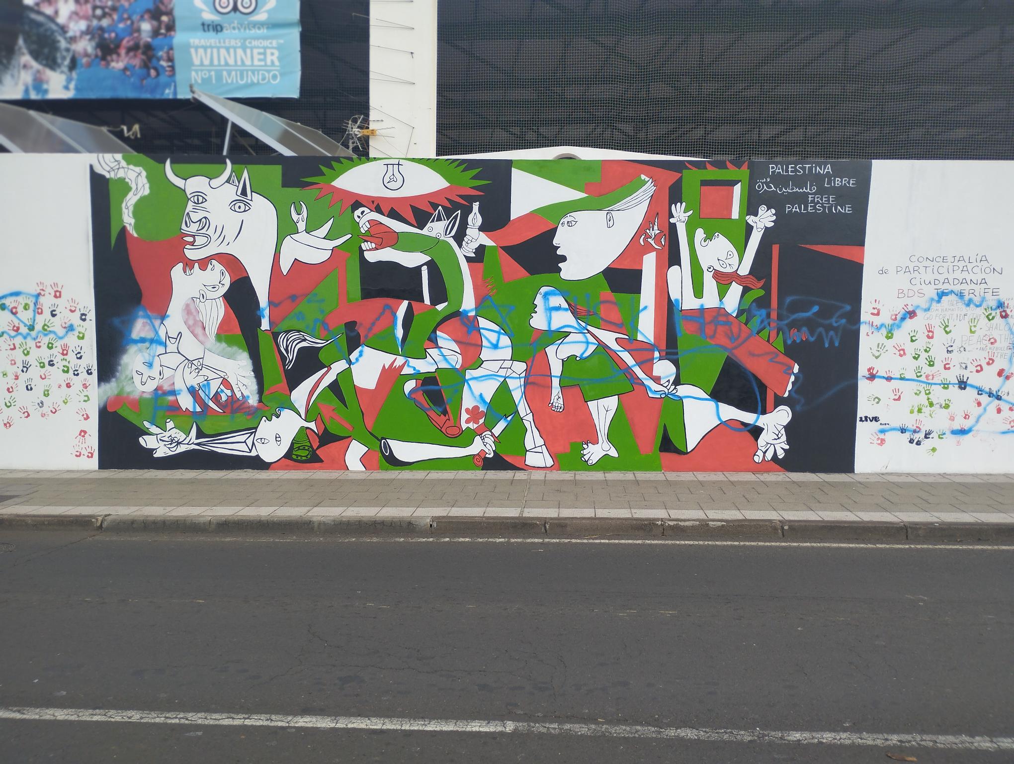 El mural participativo en apoyo al pueblo palestino que luce en el muro exterior del polideportivo Manolo Santaella de Puerto de la Cruz fue saboteado en la noche de ayer, 15 de diciembre.