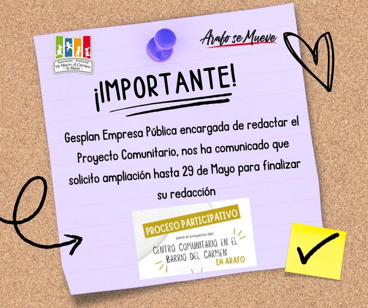 La Asociación El Carmen Se Mueve ha solicitado que se presente oficialmente el Proyecto Básico y de Ejecución para la construcción del Centro Comunitario del Barrio del Carmen, redactado por la empresa GESPLAN, en el marco de las celebraciones de las Fiestas en Honor a Nuestra Señora del Carmen, que tendrán lugar el próximo mes de julio. Este proyecto, reclamado por nuestra asociación desde el año 2013, cobró impulso a través de la anterior legislatura del Cabildo Insular de Tenerife, bajo la dirección de Pedro Martín y Nauzet Gugliotta, quienes atendieron nuestra solicitud y establecieron las primeras negociaciones con el Ayuntamiento de Arafo y su alcalde, Juan Ramón Martín.