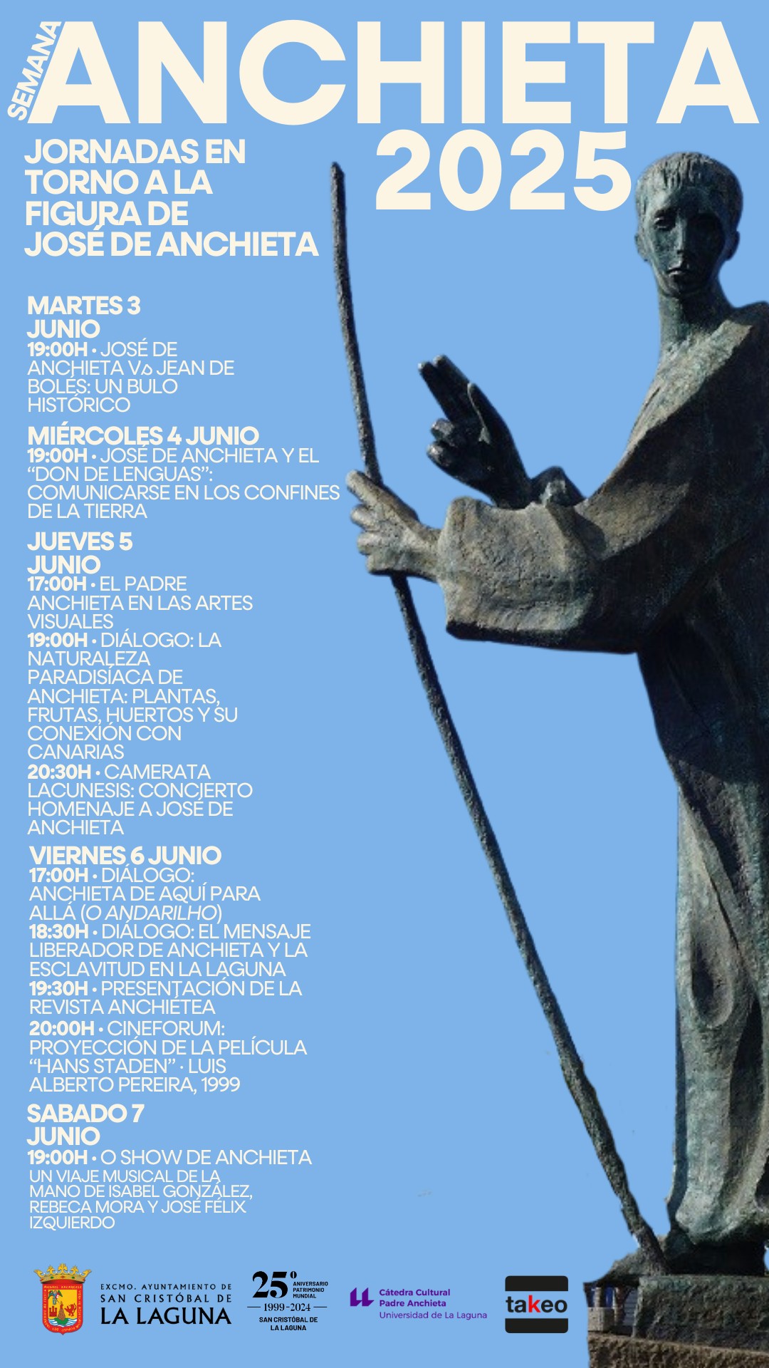 El programa finalizará el martes 10 de junio, a las 19:00 horas, con la ponencia “La escultura de Anchieta, BIC e IA”, impartida por el catedrático de Tecnología de Secundaria Antonio Hernández Hernández y promovida por la Hermandad de Caballeros y Damas de San José de Anchieta.