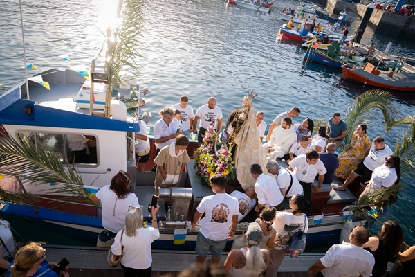 Seguidamente en el Muelle Pesquero la Virgen del Carmen a hombros de los cargadores embarcó en el Marino para llevar a cabo la procesión Marítima hasta Bajo La Cuesta y Las Caletillas y regreso al Muelle Pesquero y comenzar la procesión de vuelta a la Parroquia de Santa Ana, acompañada por fieles, autoridades y la Banda de Música Las Candelas