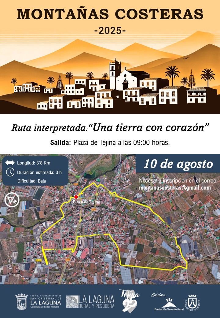 El proyecto educativo ‘Montañas Costeras’ continúa su periplo por distintos núcleos del litoral lagunero y este domingo centrará su actividad en el entorno de Tejina, coincidiendo con las fiestas patronales en honor a San Bartolomé. Para esta ocasión tan especial, la concejalía de Desarrollo Rural del Ayuntamiento ha diseñado una jornada divulgativa que pondrá el acento en el patrimonio, la cultura y saberes populares, el paisaje rural y los elementos más representativos de este pueblo.