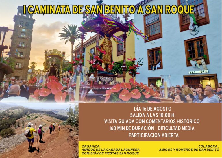 La Laguna acoge este sábado, día 16, la primera caminata de San Benito a San Roque, una iniciativa organizada por la Asociación Amigos de la Cañada Lagunera con la colaboración de Amigos y Romeros de San Benito, la comisión de fiestas de San Roque 2025 y el Ayuntamiento de La Laguna.