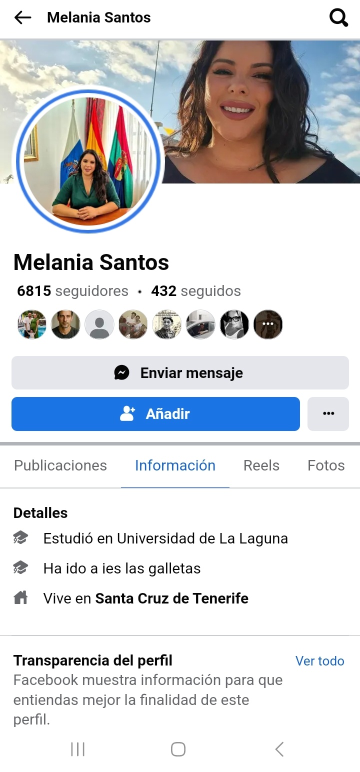 ¿Qué quieren que les diga? Muy gráfico y contundente. Vamos al lío. Melania Santos incluye en su Facebook personal con 6.814 seguidores y 4974 amigos lo siguiente: “estudió en la Universidad de La Laguna y ha ido a IES Las Galletas”. ¿En serio? ¿Dónde estudió? ¿Dentro del aula, fuera en el campus, al raso, bajo techo? ¿Qué estudio, hasta donde llegó, si acabó, si lo dejo? Solo estudió. Y lo mejor, acudió a un instituto. ¿A tomar café, a ver a un amigo, al recreo, a dar un paseo, a jugar al escondite? ¿A qué acudió? ¿A escuchar al profesor desde fuera, desde dentro? Más alucinante todavía.