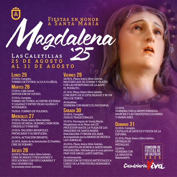 El Ayuntamiento de Candelaria, en colaboración con la Asociación de Vecinos El Pueblito, organiza un completo programa de actos para las Fiestas en honor a Santa María Magdalena en Las Caletillas, que se desarrollarán del 25 al 31 de agosto de 2025 y que combinarán tradición, cultura, deporte y convivencia vecinal.
