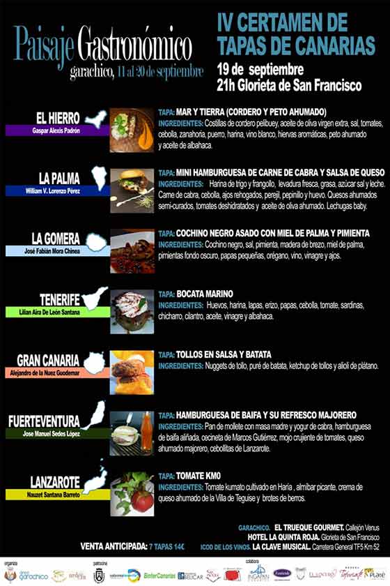 La Villa y Puerto de Garachico acogerá la cuarta edición de este concurso el próximo sábado 19 de septiembre a partir de las 21.00 horas en la glorieta de San Francisco. Cada chef preparará 300 unidades de su tapa para que el público la deguste y decida cuál es la ganadora de esta edición. Antonio Jacobo Negrín Mora, representando a La Gomera, fue el ganador del pasado 2014 con la tapa ‘Corneto pal verano’.