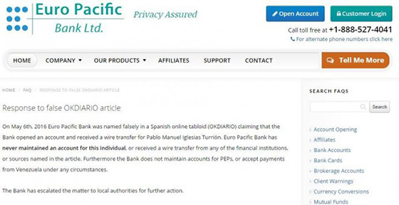 El Euro Pacific Bank Ltda, con sede Kingstown, capital de la isla-estado caribeña San Vicente y las Granadinas, niega rotundamente que en su entidad bancaria “exista una cuenta a nombre de este señor [el secretario general de Podemos, Pablo Iglesias] y que se haya recibido una transferencia bancaria procedente de cualquier institución financiera, tal como cita en el artículo [publicado en un diario digital].