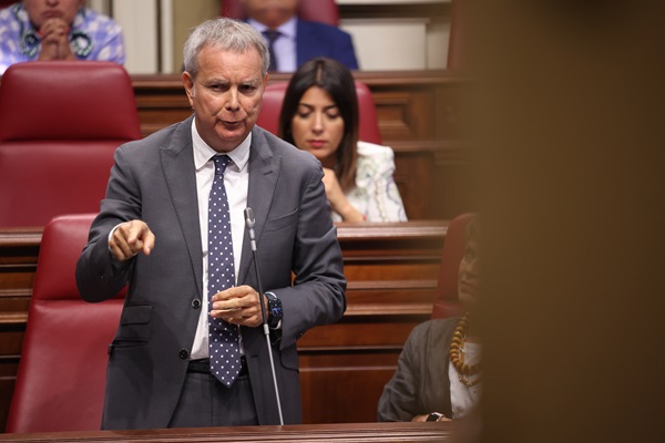El portavoz del Grupo Parlamentario Socialista, Sebastián Franquis, denucia en el Pleno de la Cámara regional que Clavijo acuse al Estado de “amenazar, atacar y presionar” a las islas y actuar como un matón de colegio, cuando quien “amenaza, presiona y actúa como un matón de colegio” es su Ejecutivo
