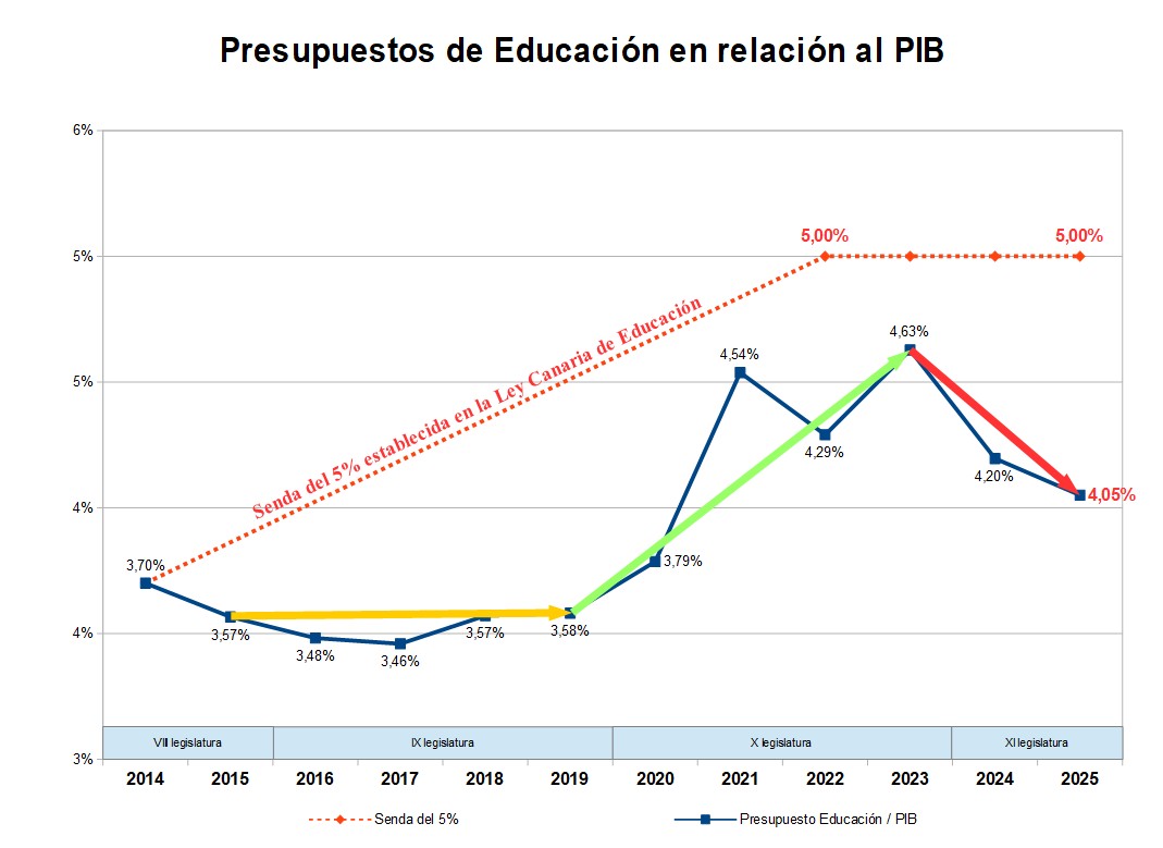 Como se sabe, la aprobación de la Ley Canaria de Educación en 2014 supuso un compromiso claro por parte del Gobierno de Canarias de aumentar progresivamente los recursos destinados al sistema educativo. Esta ley establecía que, en un plazo de ocho años, la inversión en educación debía alcanzar al menos el 5% del Producto Interior Bruto (PIB). Sin embargo, transcurridos once años desde su entrada en vigor, los datos reflejan un incumplimiento sistemático de esta meta, que se ha agravado sustancialmente en esta legislatura.