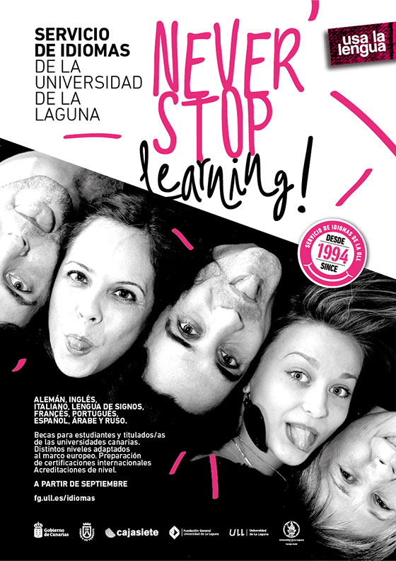 Estas ayudas se incluyen en la programación formativa de idiomas del primer cuatrimestre del servicio universitario que está compuesta por cursos de distintos niveles de inglés, alemán, francés, italiano, ruso, lengua de signos española, portugués y árabe. Además, la oferta también incluye cursos específicos para jóvenes, de conversación o de atención al cliente; así como preparatorios para la obtención de certificaciones internacionales (Cambridge University, Trinity College, ACLES o Goethe Institut, entre otras). Las clases comenzarán a impartirse a partir del 21 de septiembre y se extenderán hasta el mes de enero. Como ya viene siendo habitual, el Servicio de Idiomas universitario identifica cada una de las campañas de difusión de sus cursos con la generación de un lema escogiendo en esta ocasión la frase “¡Nunca dejes de aprender!”, con su versión en inglés “Never stop learning”, mediante la que se quiere recalcar la importancia del aprendizaje continuo a lo largo de toda la vida.