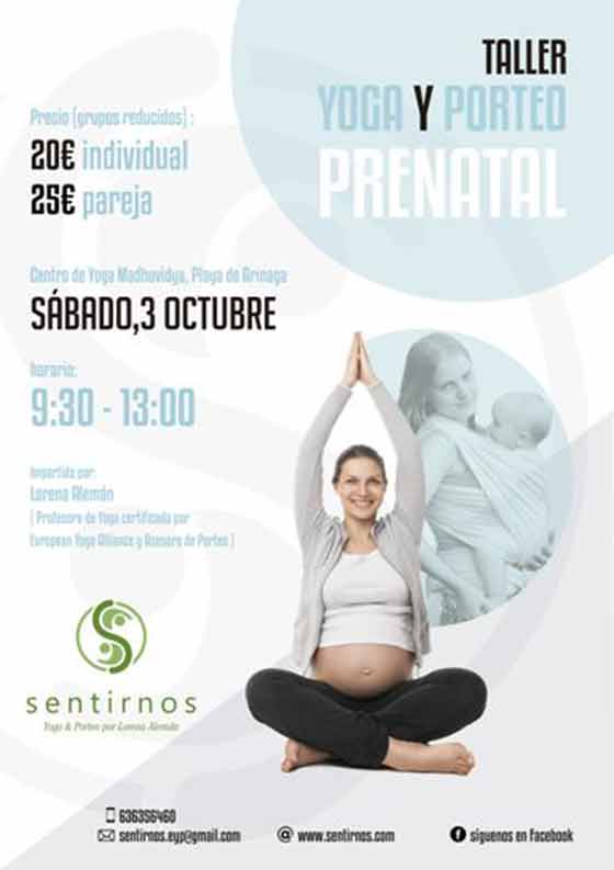 La Escuela de Yoga & Porteo Sentirnos organiza un taller de Yoga & Porteo Prenatal el próximo 3 de octubre en Playa de Arinaga (Agüimes, Gran Canaria) para mujeres embarazadas. Una jornada de tres horas y media (de 9.30 a 13.00 horas) donde se llevará a cabo una sesión de Hatha Yoga Prenatal (ásanas/posturas), seguida de relajación y se les iniciará en la meditación. La segunda parte del Taller se dedicará al Porteo Ergonómico (técnicas para aprender a llevar los hijos de manera segura y sobre nosotros mismos con la ayuda de algún instrumento – fular, mochila, mei tai…). El Taller está dirigido a mujeres embarazadas (y sus parejas) y a todas aquellas personas interesadas en aprender sobre estas dos ciencias. El curso será impartido por Lorena Alemán (Profesora de Yoga Certificada por la European Yoga Alliance y Asesora de Porteo). Más información en http://sentirnos.com/porteo/