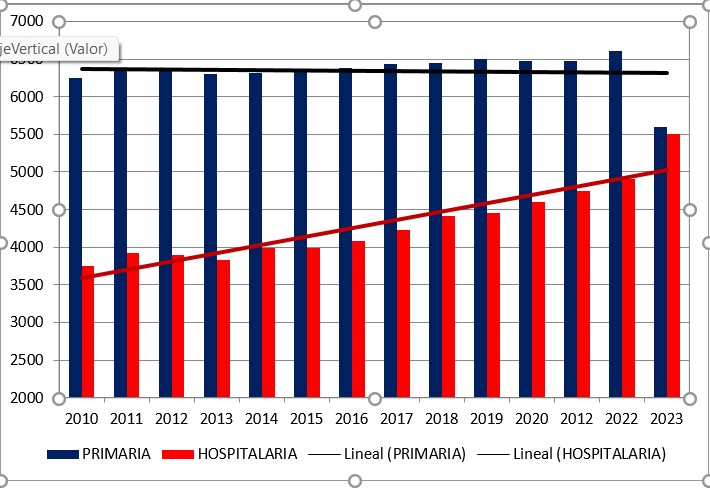 Las cifras que aporta este último informe es que los Pediatras de AP en el sistema público son un total de 5.600, y los hospitalarios, 5.500. Por tanto, desde 2010 a 2023 se habría producido una disminución del 10% en Primaria y un aumento de un 46% en hospitales.