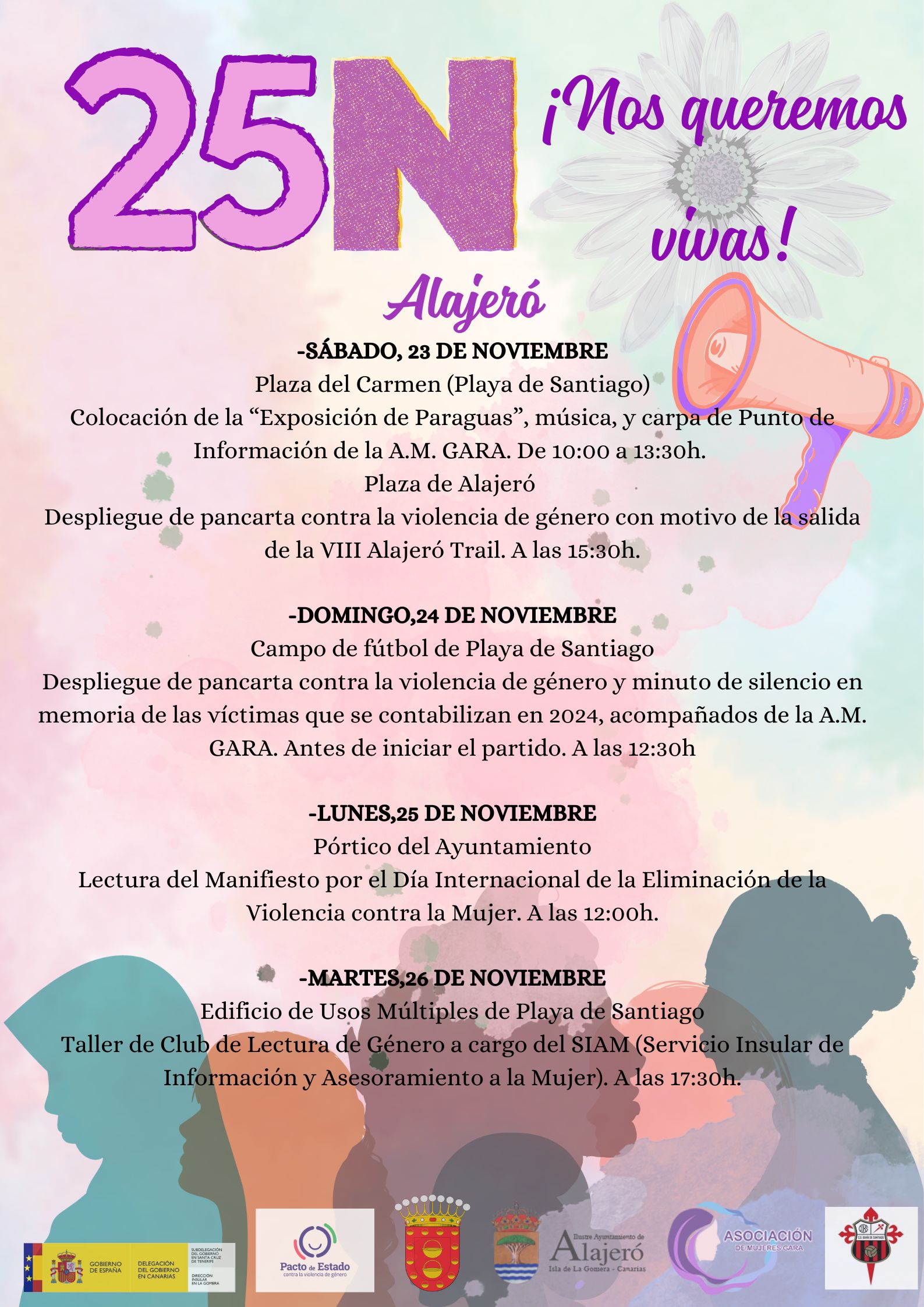 La Concejala de Servicios Sociales e Igualdad Águeda Franquis, agradece la participación de numerosos colaboradores como la Asociación de Mujeres Gara, el Servicio Insular de Información y Asesoramiento a la Mujer, la Dirección Insular de la Administración del Estado en La Gomera, el Instituto Canario de Igualdad, el Cabildo Insular de La Gomera, a la empresa Eulen, al Gobierno de Canarias y al Club Deportivo Bahía Santiago en estos eventos al tiempo que se invita a la población en general a asistir a unos encuentros que tienen como principal objetivo la protesta y estupor por las consecuencias que se generan a raíz de una violencia inexplicable y sin sentido.