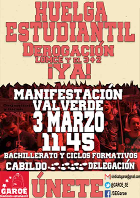 Con motivo de los sucesivos recortes en educación, la aplicación de la Lomce, el 3+2 universitario, así como el aumento de las tasas universitarias y la ley de permanencia, las prácticas no remuneradas en empresas en el entorno de los ciclos de grado medio y superior, entre otros, la coordinadora de Estudiantes de Gran Canaria, convoca una huelga estudiantil para el día 3 de marzo, celebrando así una concentración que tendrá lugar ese mismo día a las 11:30 de la mañana en el Parque San Telmo.