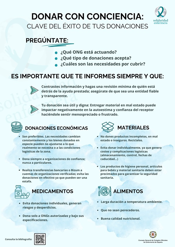 Asimismo, desde Solidaridad Enfermera aportan consejos si lo que se quiere es donar medicinas o alimentos. En el primer caso, piden que sigan la normativa para garantizar su trazabilidad y uso seguro, y solo si una ONG lo ha pedido de manera concreta. Y además, que se canalicen a través de entidades especializadas en ello. En lo que se refiere a alimentos, pautan que estos tengan larga duración a temperatura ambiente, que no sean perecederos y que tengan buena calidad nutricional.